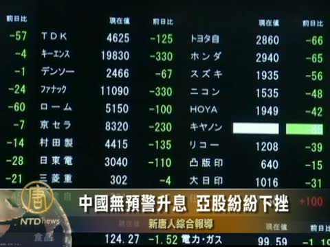 【新唐人2010年10月20日訊】亞股週三早盤多數下挫,類股方面,以原物料類股跌勢最兇。前一天,中國人民銀行意外宣佈,將存貸款利率調升0.25個百分點,這是中國三年以來首度調息,希望減輕國內通膨壓力,這促使投資人拋售持股。