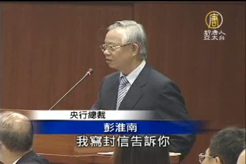 【新唐人亞太台2010年10月20日訊】央行總裁彭淮南今天(20號)到立法院報告,對於近期台幣升值的幅度,有人批評台幣被低估,彭淮南駁斥,還舉例有人遠從英國寫信肯定央行的貨幣政策,另外立委們也關心中國的升息動作,會不會影響台灣的股匯市,彭淮南回答很保守,要將一切交給市場決定。