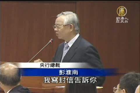 【新唐人亞太台2010年10月20日訊】央行總裁彭淮南今天(20號)到立法院報告,對於近期台幣升值的幅度,有人批評台幣被低估,彭淮南駁斥,還舉例有人遠從英國寫信肯定央行的貨幣政策,另外立委們也關心中國的升息動作,會不會影響台灣的股匯市,彭淮南回答很保守,要將一切交給市場決定。