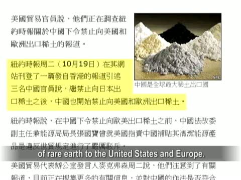 【新唐人2010年10月21日訊】中國9月下旬以來禁止稀土出口日本,現在已悄悄擴大禁令,對美國和歐洲也禁運稀土。雖然中共官方否認了這一說法,但中共官員此前的暗示、和目前稀土出口動作,都讓中共的稀土政策曖昧不明。美國、歐盟和日本正考慮將中共的出口限制,訴諸WTO的仲裁部門。