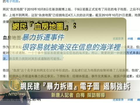 【新唐人2010年10月24日訊】最近,中國網民製作了一張標注『暴力拆遷』事件發生地的電子地圖,點擊地圖上的電子標識,就可以追蹤每起「暴力強拆」事件的概況。該活動發起人期望能藉此,遏止暴力拆遷事件的發生。