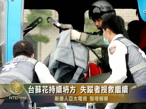 【新唐人2010年10月27日訊】台灣蘇花公路災變進入第6天,搶救作業因為天候不佳受阻,26日一整天下來,救難人員只在112.8公里處下方海邊,尋獲一塊大約手掌大的罹難者屍塊,陸地海域搜尋幾乎沒有進展。帶您快速瀏覽,當天蘇花公路持續搜救的情況。