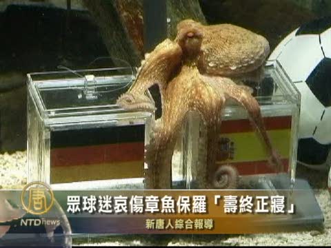 【新唐人2010年10月27日訊】10月26號(星期二),德國奧伯豪森水族館宣佈,在今年足球世界盃上,8猜8中,100%比賽結果預測準確率的章魚保羅,在頭條晚上死去。消息傳出,球迷一片哀傷。