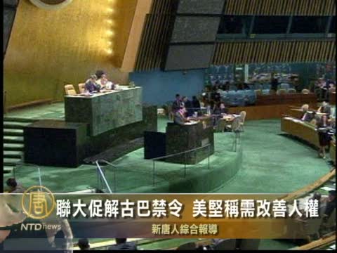 【新唐人2010年10月27日訊】本週二(10月26日),聯合國大會以壓倒性多數,連續第19年通過一項不具約束力的決議,敦促美國解除已持續48年之久的古巴貿易禁令。然而美國表示,古巴人民獲得被國際社會認同的政治權利和經濟自由是美國徹底解除禁令的前提。