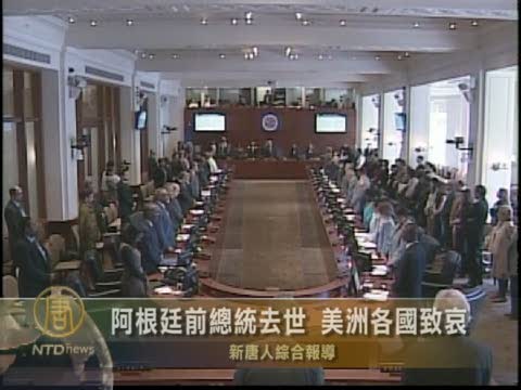 【新唐人2010年10月28日訊】10月27號(星期三),阿根廷現總統克里斯蒂娜•費爾南德斯(Cristina Fernandez)的丈夫,阿根廷前總統基甚內爾(Nestor Kirchner)心臟病發作後去世,享年60歲。對此,美國總統奧巴馬向阿根廷人民慰問,美洲國家組織等聯盟和國家也向阿根廷致哀。