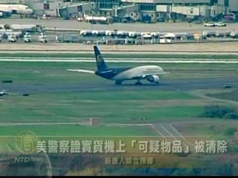 【新唐人2010年10月30日訊】10月29日,紐約警察局長證實,一架貨機上的“可疑包裹”被清除。與這件來自業門的“可疑包裹”有關的一些飛機也將接受安全檢查。
