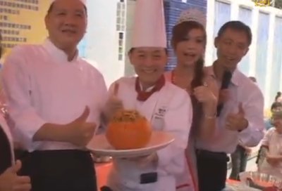 就在這時,另一位大廚,阿財師,新竹市長許明財,也來露一手,不但翻炒米粉有模有樣,還幫忙試味道。