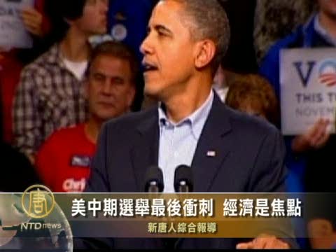 【新唐人2010年10月31日訊】10月30號(星期六),距離美國11月2號的中期選舉只有3天的時間了,包括美國總統歐巴馬、前總統候選人馬侃等在內的兩黨重量級成員,在各地發表演講,為議員候選人助威。