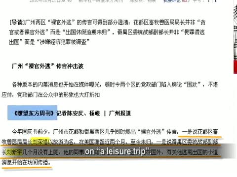 《瞭望東方週刊》21號報導,「十一」前夕,廣州市花都區畜牧獸醫局局長劉榮福以旅遊爲名,在美國滯留近兩個月,至今未歸;而另一個是番禺區委統戰部副部長劉新宇,已經幾個月沒有上班,他的同事也不知道他的去向,因劉新宇的妻子在國外,有關他逃離出國的小道消息開始在坊間傳播。http://news.qq.com/a/20101021/000917.htm