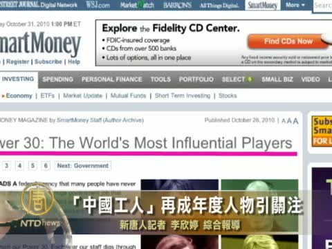 【新唐人2010年11月1日訊】10月29日,美國道瓊斯公司旗下知名財經雜誌《財智》選出了2010年“全球最具影響力人物”,繼去年入選《時代》年度人物後,“中國工人”再次作為一個群體榜上有名。有媒體評論指出,雖榜上有名,“中國工人”的身份,並沒有獲得包括他們自己在內的社會的認同,“中國工人”是中國社會裏貶值最厲害的群體。