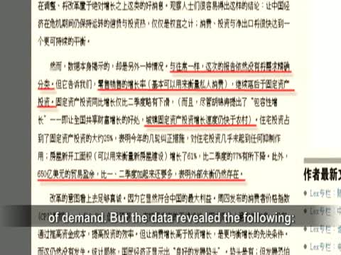 對中共官方發佈的三季度數據報告,Lex說,與往常一樣,這次的報告依然沒有將需求精確分類。但這些數據卻揭示了:中國的消費增長仍然慢於投資增長﹔城鎮投資增長仍然快於農村投資﹔650億美元貿易盈餘在第三季度比今年上半年加起來還多,這意味著外部失衡日趨嚴重。