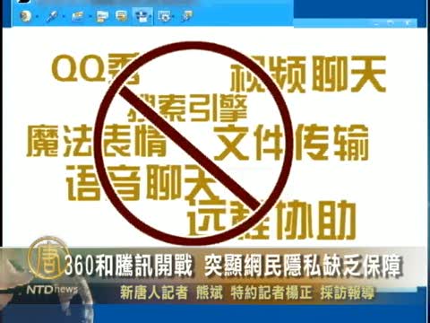 【新唐人2010年11月5日訊】近擁有龐大中國網民用戶的兩大軟體運營商奇虎公司360和騰訊QQ,因為「隱私保護器」事件,公然開戰,騰訊3日宣稱,將在裝有360軟體的電腦上停止運行QQ。大陸網民認為兩家公司間的矛盾,突顯了網民的隱私權缺乏保障。
