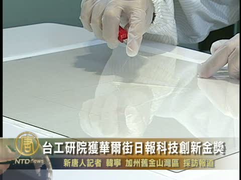 【新唐人2010年11月6日訊】台灣工研院2009 年以「超薄軟性音響紙喇叭」獲得華爾街日報科技創新獎消費性電子類的首獎後,2010年他們研發的“多用途軟性電子基板技術”,贏得了今年“華爾街日報科技創新獎”同一獎項及最高榮譽的「金獎」。