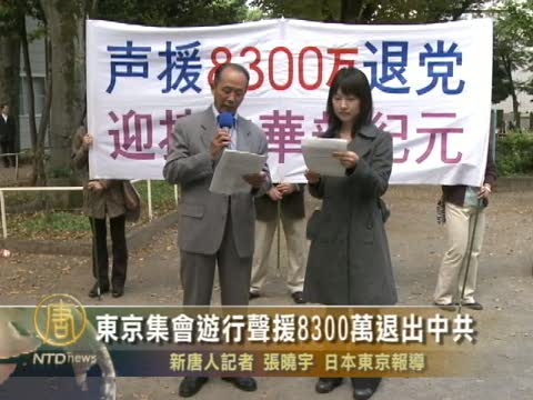 【新唐人2010年11月8日訊】11月7日,日本東京舉行了聲援退出中共,反對迫害的集會和遊行。來自日本民主中國陣線的夏一凡等在集會上譴責中共所實施的慘無人性的人權迫害,同時祝賀8300萬人在大紀元網站上聲明退出了中共的黨,團,隊。下面請看來自日本的報導。