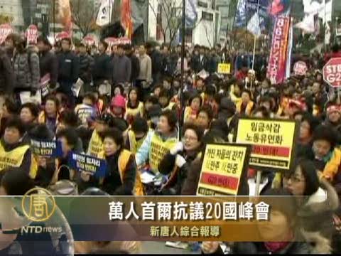 【新唐人2010年11月12日訊】和歷次的20國峰會一樣,此次的20國峰會也聽到了抗議的聲音,有大約一萬人星期四走上首爾街頭抗議20國峰會,他們表示各國首腦應該為經濟危機負責。