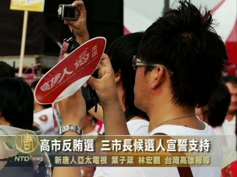 【新唐人2010年11月14日訊】台灣地檢署14號下午舉辦反賄選宣傳,難得的是,三位大高雄市長候選人打破藍綠色彩,同時站上反賄選舞臺,齊聲宣誓拒絕賄選,剷除不法、淨化選風。