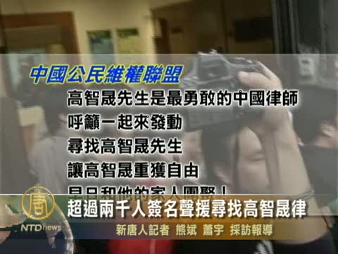 【新唐人2010年11月15日訊】著名的中國維權律師高智晟從今年4月20日失蹤至今音訊全無,從10月22日開始,由中國公民維權聯盟發起的“共同尋找失蹤英雄高智晟”簽名活動,到11月14號已突破2000人簽名聲援,簽名者希望能找到高智晟的下落,並喚醒更多人關注中國人權問題。