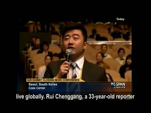 在12號舉行的南韓首爾G20峰會上,歐巴馬離開韓國前特別舉行一場記者會,幷作全球直播。33歲的央視記者芮成鋼與各國記者一起出席記者會。歐巴馬在答記者問題現場表示,最後一個問題留給東道國韓國,但央視記者芮成鋼突然搶過話筒自報家門,幷表示要“代表亞洲”向歐巴馬提問。但歐巴馬堅持要把機會給韓國記者。兩人為此展開口舌之戰。