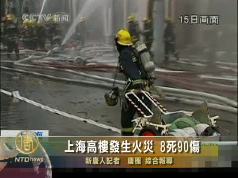 【新唐人2010年11月16日訊】上海江岸區一棟28層大型樓房在星期一下午發生火災,大火從白天延燒到晚上,已知至少8人死亡90餘人受傷。