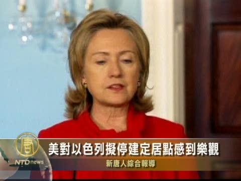 【新唐人2010年11月16日訊】美國國務卿希拉里•克林頓星期一(11月15號)表示,以色列總理內塔尼亞胡提出的,暫停在西岸修建定居點的草案是一個很令人樂觀的消息。另外,她也對美軍駐阿富汗近日來的軍事突擊活動進行了辯護。