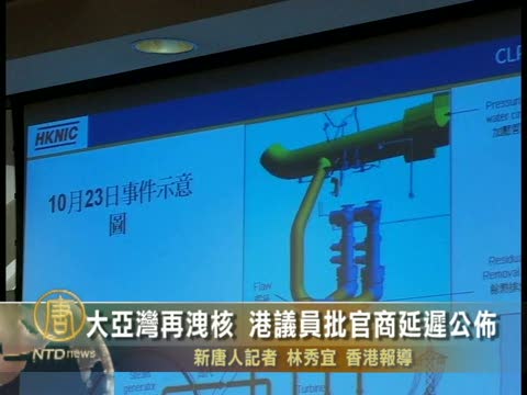 【新唐人2010年11月17日訊】臨近香港的大亞灣核電廠上月再次發生洩核事故,身為大股東的香港中華電力公司在事隔三週後,星期一才對外透露事件。立法會保安事務委員會星期二召開緊急會議,多位議員批評中電延遲公布,漠視市民的安全。