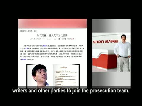 【新唐人2010年11月18日訊】《盛大文學網》呼籲大陸出版業界聯合起訴百度的事,最近在互聯網上鬧得沸沸揚揚,曾經因為著作權問題炮轟谷歌的「中國文字著作權協會」也公開表示支持,並在強烈譴責百度的同時,希望與谷歌重啓談判。