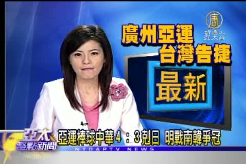 【新唐人亞太台2010年11月18日訊】來關心今晚的最新消息,廣州亞運棒球賽,中華對戰日本,中華隊一路以3:0領先,9局下半日本隊打者敲出一支3分全壘打把比數追平,雙方進入延長賽,延長賽中華隊先攻取得4:3領先,日本隊後攻沒有得分,終場 中華隊以4:3獲勝,明天將和南韓爭奪金牌。