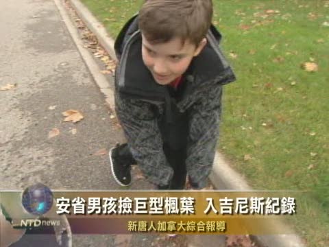 【新唐人2010年11月19日訊】安省一名9歲的男孩找到了一片巨型楓葉,這片楓葉也為他贏得了一項吉尼斯世界記錄。