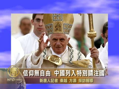 在200個被評估宗教自由度的國家當中,中國與北韓、緬甸等八個國家,一同被列入特別受關注國家。 18號,梵蒂岡新聞辦公室發佈聲明,對中國天主教會未經教皇批准,準備在20號擅自任命一名主教,並強迫大陸所有主教參加這次晉牧典禮表示強烈關注.