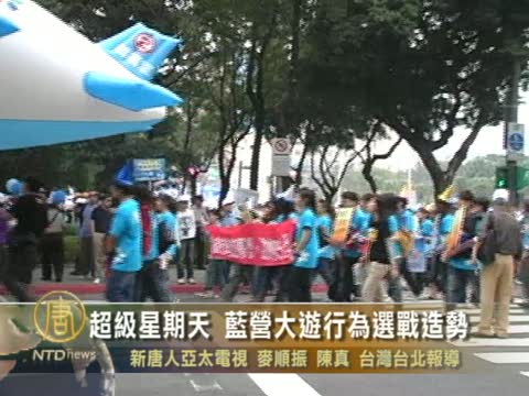 【新唐人2010年11月21日訊】台灣五都選舉前的最後一個星期天。北二都上演重頭戲。藍營在臺北號召三萬民眾上街,舉辦大遊行。國民黨籍現任臺北市長郝龍斌力拼選票,爭取連任,總統馬英九也親自助陣。