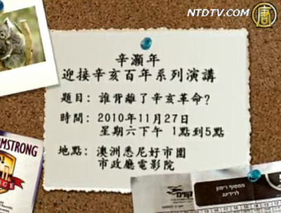 【新唐人2010年11月26日訊】辛灝年 “迎接辛亥百年系列演講” 《誰背離了辛亥革命?》2010年11月27日(周六)下午1點到5點,澳洲悉尼好市圍 市政廳電影院。