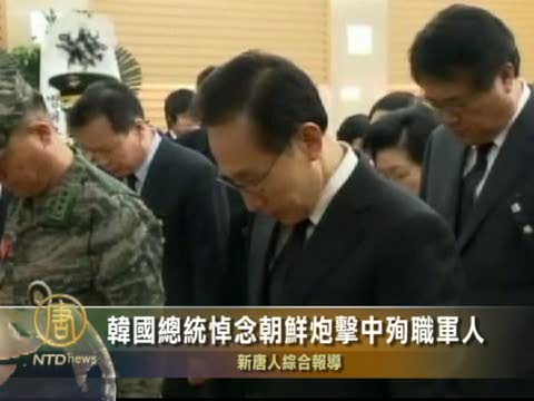 【新唐人2010年11月26日訊】星期五(11月26日),韓國總統李明博(Lee Myung-bak)在一個悼念儀式中,向在朝鮮砲擊事件中殉職的兩名軍人致敬。當天下午,朝鮮境內又傳出遠距炮火射擊的聲音,使韓國延坪島的緊張情勢再度升高。