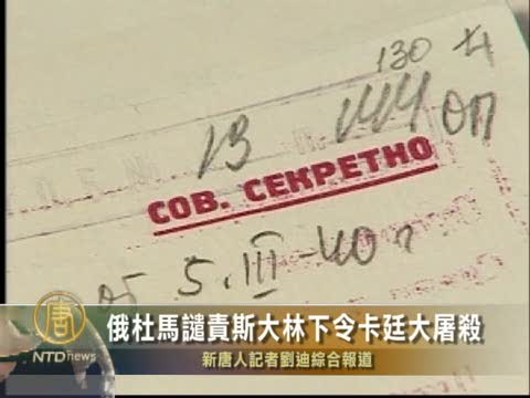【新唐人2010年11月27日訊】週五(11月26日),俄羅斯議會下院杜馬批准了一項決議,對前蘇聯獨裁者斯大林下令卡廷大屠殺進行譴責。