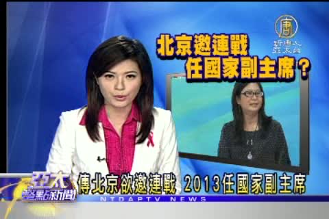 【新唐人亞太台2010年12月1日訊】那麼關於連家,今天還有另外一個消息,那就是根據香港「鏡報」月刊最新一期的報導內容指出,北京方面可能邀請台灣前副總統、國民黨榮譽主席連戰,在2013年的全國人大會議上,出任中共國家副主席,對此,國民黨是拒絕評論。而陸委會主委賴幸媛則是依據兩岸人民關係條例,說:台灣人民不可以到中國擔任任何公職。帶您來看下午記者會賴幸媛的回應。