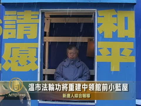 【新唐人2010年12月2日訊】溫哥華法輪功學員在中領館外的大型抗議展板,和小藍屋可能在今年冬天重新建起來。
