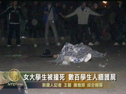 【新唐人2010年12月2日訊】中國河南省平頂山學院,近日一名大三女生被撞死,肇事車輛逃逸。數百名同校學生排起“人牆”,保護女學生屍體及事發現場,等待警察採證。據學生發帖透露,報警後一個半小時警察才到,到場的公共安全專家還“一身酒氣”。