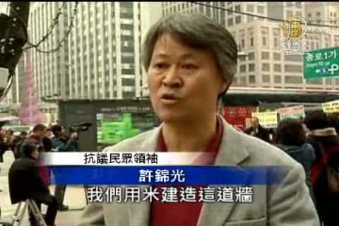 數十名南韓示威民眾聚集在首爾市中心,排成人牆,並擺出五十袋大米,要求南韓政府停止輸出北韓大米和其他人道援助。