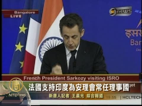 【新唐人2010年12月4日訊】12月4號(星期六),正在印度訪問的法國總統薩爾科奇支持印度成為聯合國常任理事國,讚揚印度的和平發展道路,並支持印度和平利用核能。