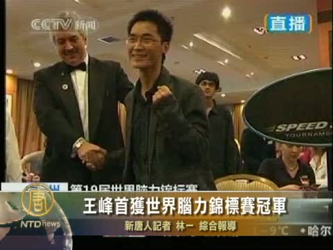【新唐人2010年12月6日訊】為期兩天的第19屆世界腦力錦標賽於當地時間12月5號晚在中國廣州閉幕。來自武漢大學的20歲中國選手王峰,成為第一位獲得錦標賽冠軍的中國選手。