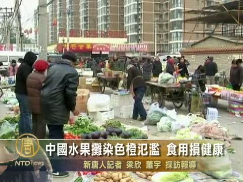 【新唐人2010年12月8日訊】秋冬是橙子的盛產季節,近期,中國從南到北市場充斥著染色橙的蹤影﹔水果商將一些橙子經過打蠟染色處理,使表皮看起來更光鮮亮麗,價錢更好,但專家警告,食用遭到色素污染的果肉,可能對人體造成不良影響。