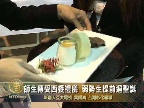 【新唐人2010年12月13日訊】聖誕節快要到了!許多人都在想,要到哪邊慶祝?台灣彰化達德商工觀光科的20多名師生,這個週末犧牲假期,選擇以教導自強家庭小朋友用餐禮儀的方式,和這些小朋友共慶聖誕。