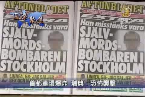 【新唐人亞太台2010年12月13日訊】來關心國際重要訊息。瑞典當局12號將先前一天(11號)晚上首都斯德哥爾摩市中心發生的連環爆炸列為恐怖襲擊,並加強了保安措施,同時對事故展開調查。這兩起爆炸事件,共造成1人死亡,兩人受傷。