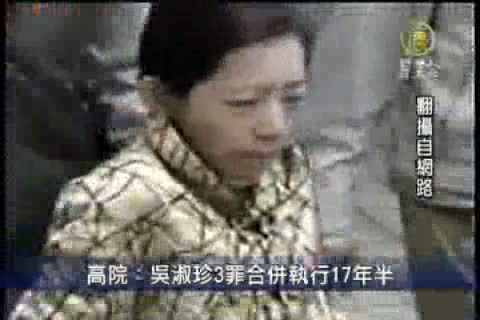 【新唐人亞太台2010年12月13日訊】來看一則最新消息,前第一夫人吳淑珍執行刑確定,台灣高等法院今天(13號)晚間裁定,吳淑珍所涉及的龍潭購地案、陳敏薰案及洗錢案等三案,分別被判刑11年、8年及7個月徒刑,3罪合併執行刑共17年6個月,併科罰金1億5400萬元,刑度和罰金都跟前總統陳水扁相同。至於是否發監培德醫院,高雄地檢署還在調閱相關病歷評估中。