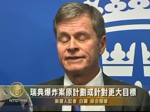 【新唐人2010年12月14日訊】瑞典一名官員星期一(12月13日)表示,瑞典斯德哥爾摩週末爆炸案的襲擊者,可能是想在人群更多的火車站和商店發動襲擊,只是沒想到身上捆綁的炸彈提前爆炸。同一天,英國警方作為協助調查爆炸案的一部份,搜查了位於英國的一處民居。
