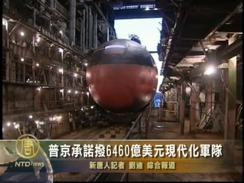 【新唐人2010年12月14日訊】星期一(12月13日),俄羅斯總理普京在參觀北德文斯克北部城鎮時說,到2020年政府承諾20萬億盧布(折合6460億美元)用於該國的軍隊現代化建設和重新武裝。