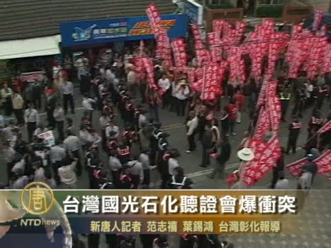 【新唐人2010年12月15日訊】經濟部工業局今天(14號)在台灣彰化縣大城鄉舉辦「國光石化興建案行政聽證會」,反對興建的環保團體與支持興建的民眾狹路相逢,爆發衝突,場內環保人士也因為不滿經濟部議程爆發口角,場內場外一片鬧哄哄。