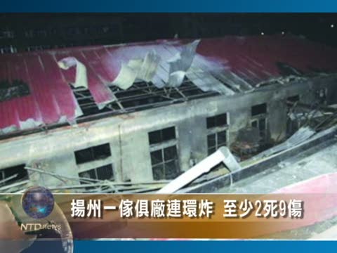 【新唐人2010年12月16日訊】據當地媒體報導,12月15號(星期三)下午,江蘇省揚州市江都開發區高徐鎮一家名為“揚州市正和木業有限公司”的傢俱廠,發生連續兩次爆炸,造成至少2人死亡,9人受傷。