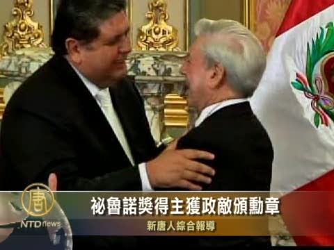 【新唐人2010年12月16日訊】15日,祕魯總統加西亞(Alan Garcia),頒發文學與藝術勳章給2010年諾貝爾文學獎得主洛沙(Mario Vargas Llosa),以表彰他對祕魯文化的貢獻。洛沙曾經是加西亞總統的政敵。