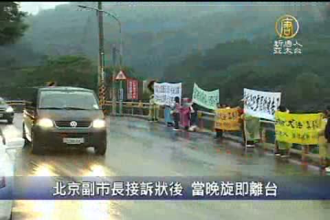 【新唐人亞太台2010年12月17日訊】接著帶您來看到,率經貿團來台參訪的北京市副市長吉林,由於嚴重參與迫害法輪功修煉者,在這個星期一(13號)抵台前,就因為「殘害人群罪」被法輪功人權律師正式控告,隨後幾天的訪台行程,一路都有法輪功學員拉著橫幅,呼籲停止迫害大陸法輪功學員。星期三(15號)更是在一天內,接連在台中與新竹兩地,收到2次法輪功學員遞交的訴狀,據了解,吉林旋即在當天(星期三)晚間7點,搭乘班機返回大陸,並沒有跟著經貿參訪團原本預定的行程到週六才離開台灣。