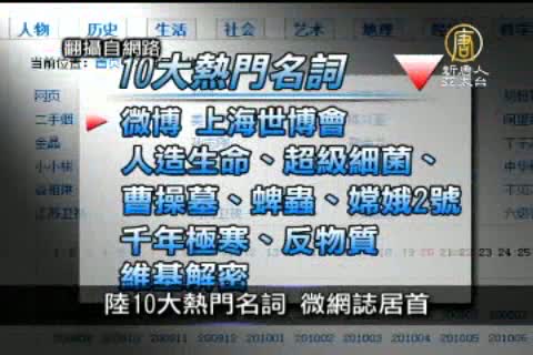 今年中國大陸哪個知識名詞最夯?答案是「微博(微網誌)」,其他依序是上海世博會、人造生命、超級細菌、曹操墓、蜱蟲、嫦娥2號、千年極寒、反物質及維基解密。
